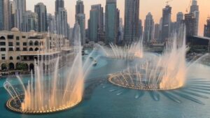 Dubai Mall’un yanındaki 30 dönümlük Burj Gölü’nün içinde yer alan güçlü su fıskiyeleri, iki futbol sahası uzunluğundaki bir alana stratejik olarak yerleştirilmiştir. Fıskiye, her seferinde 22.000 galon suyu 140 metre yüksekliğe kadar püskürtmektedir.